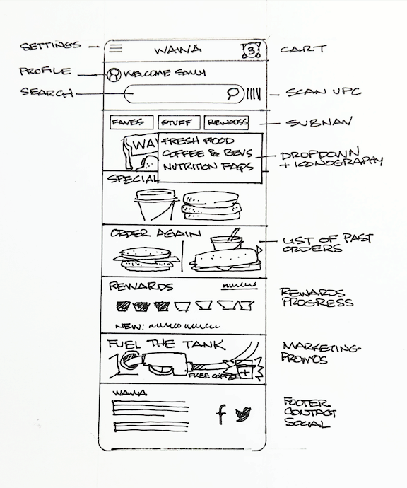 Design Sketch. We conducted guerilla user testing of innovative ordering kiosk mock-ups with Wawa customers. Their feedback directly informed daily prototype updates, resulting in informative and insightful sessions.