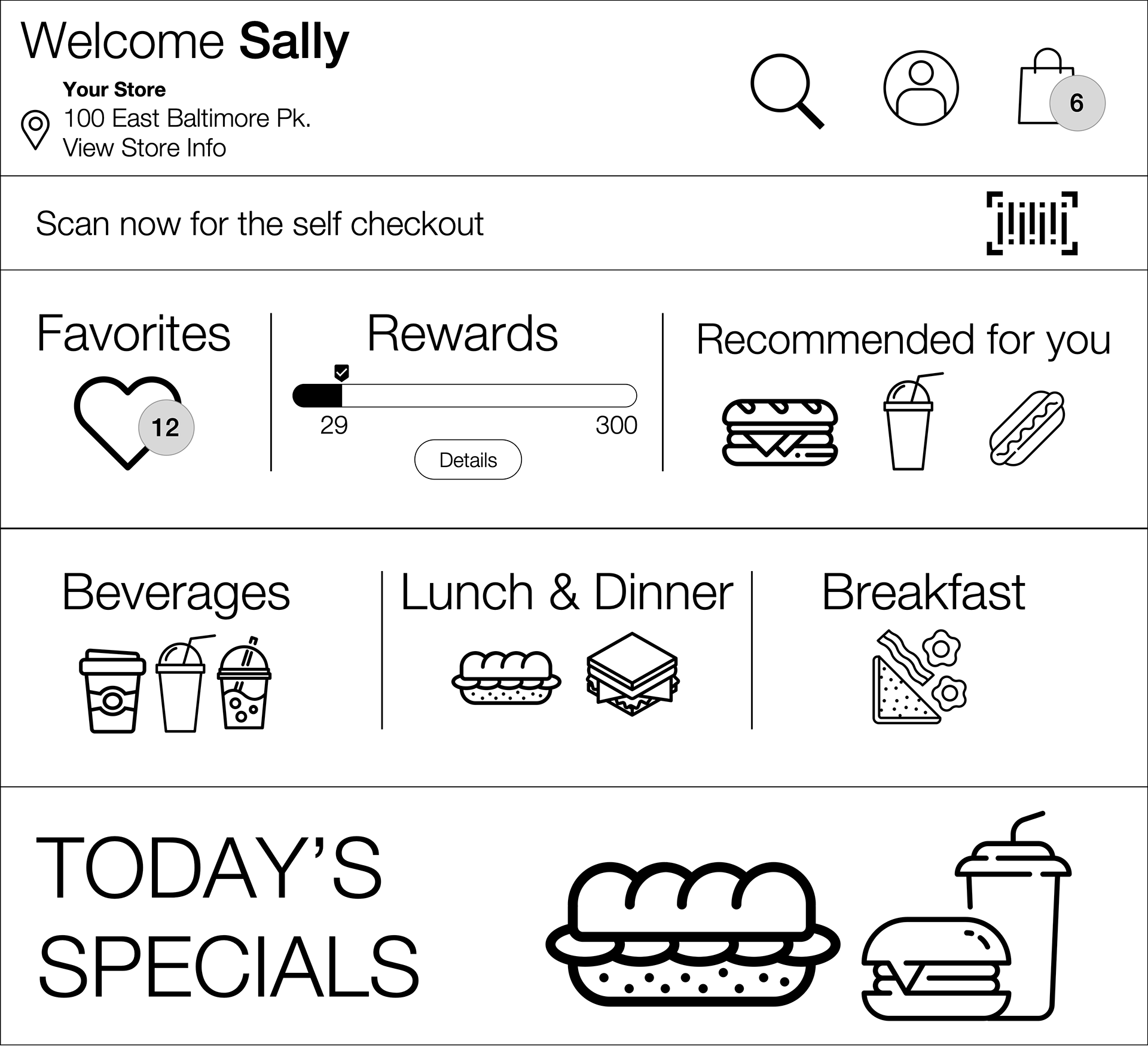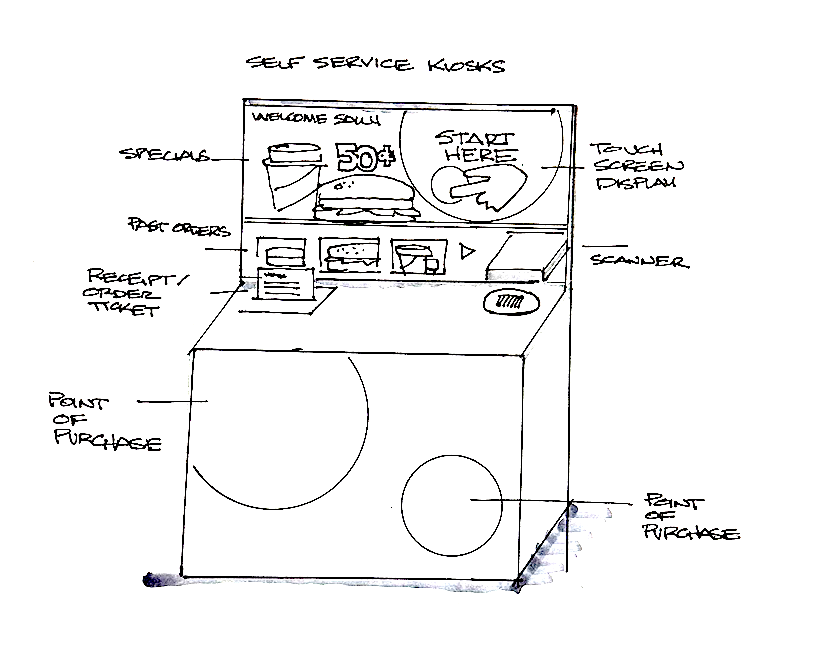 Sketch Wawa Kiosks. These prototypes envision a future Wawa kiosk that accepts digital payments, places orders, tracks purchase history, and incorporates a loyalty program with rewards and personalized recommendations. This design upgrades the existing non-transactional kiosks.