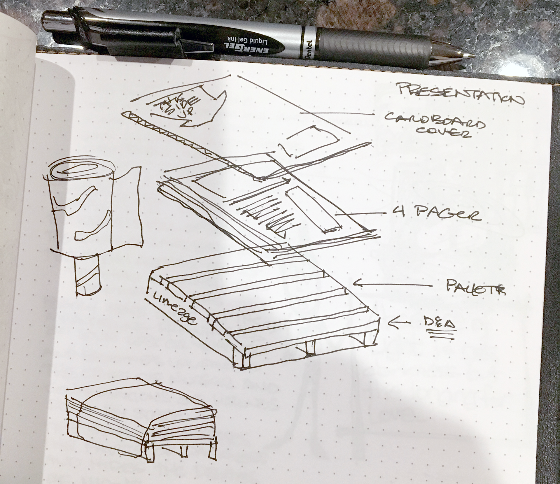 Notebook sketch. I designed and hand-built the pallet used in the Lineage bid presentation.
