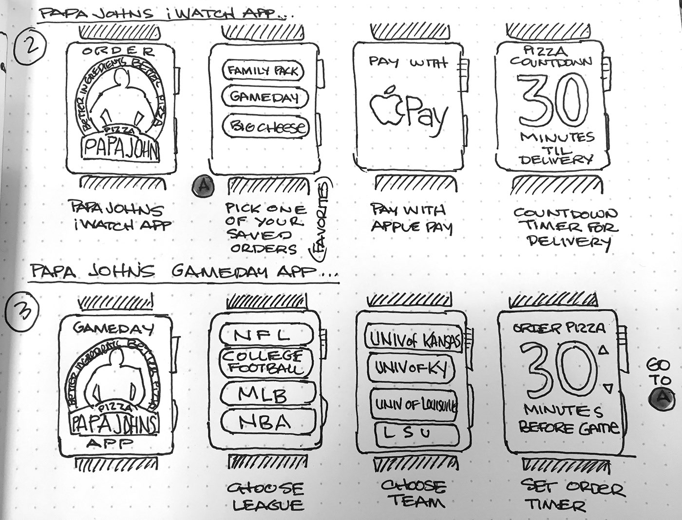 Sketch for an iWatch App. I proposed a "Game Day" concept for Papa John's, a timely reminder prompting customers to order delivery before their favorite sporting events, ensuring food arrives just as the game begins.