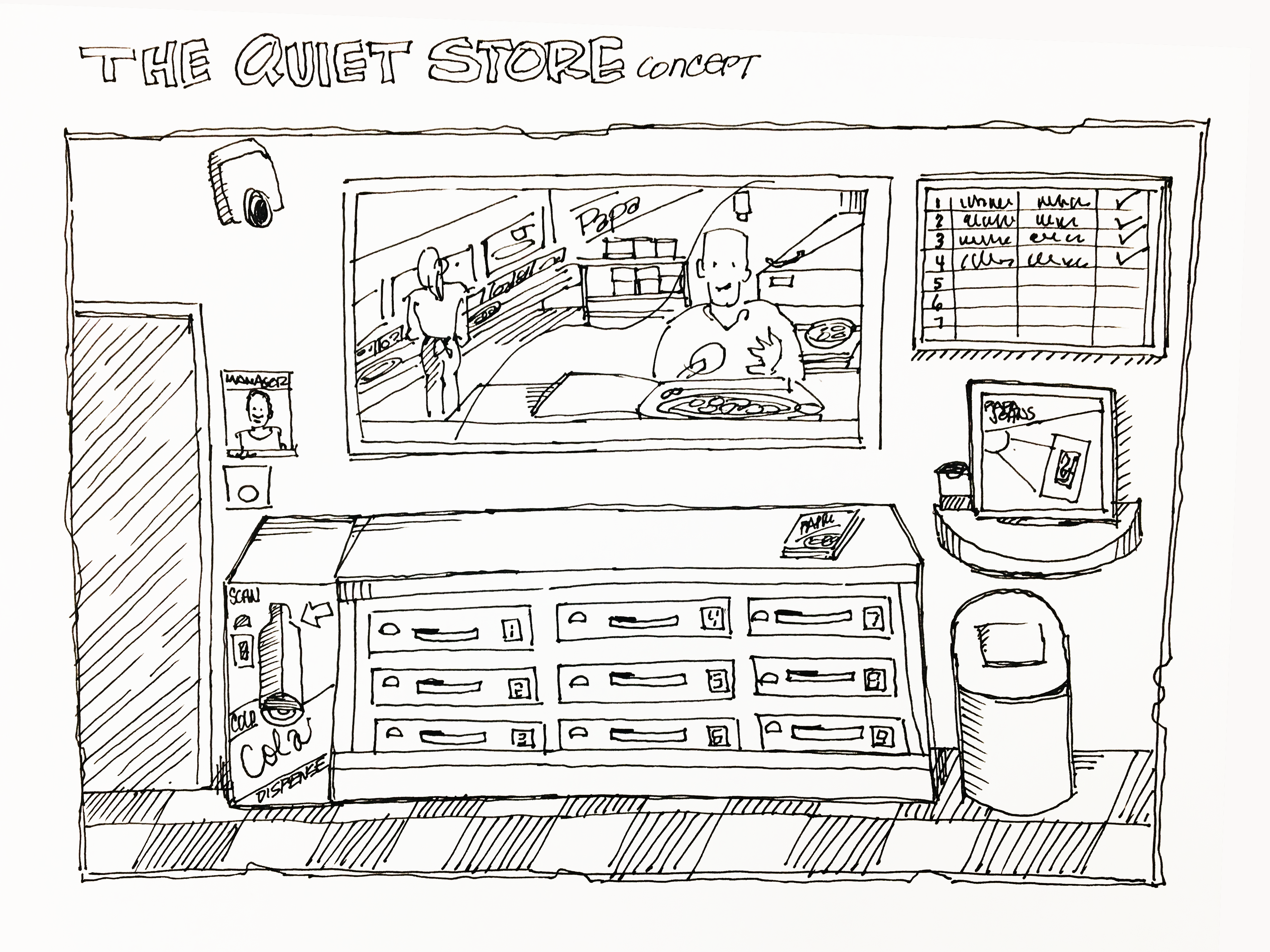 Sketch for the Quiet Store Concept. To improve the customer experience, I proposed a concept for Papa John's that separates the noisy kitchen with a glass wall. Customers would retrieve their order from a warming drawer after scanning a code at a kiosk, which could also be used to purchase additional items.